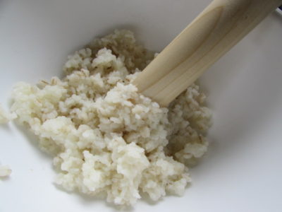1・残りご飯を、すりこ木棒などでつぶす。押し麦はちょっとつぶしにくいですけど、押し麦の食感が残るのも、また美味しいです。